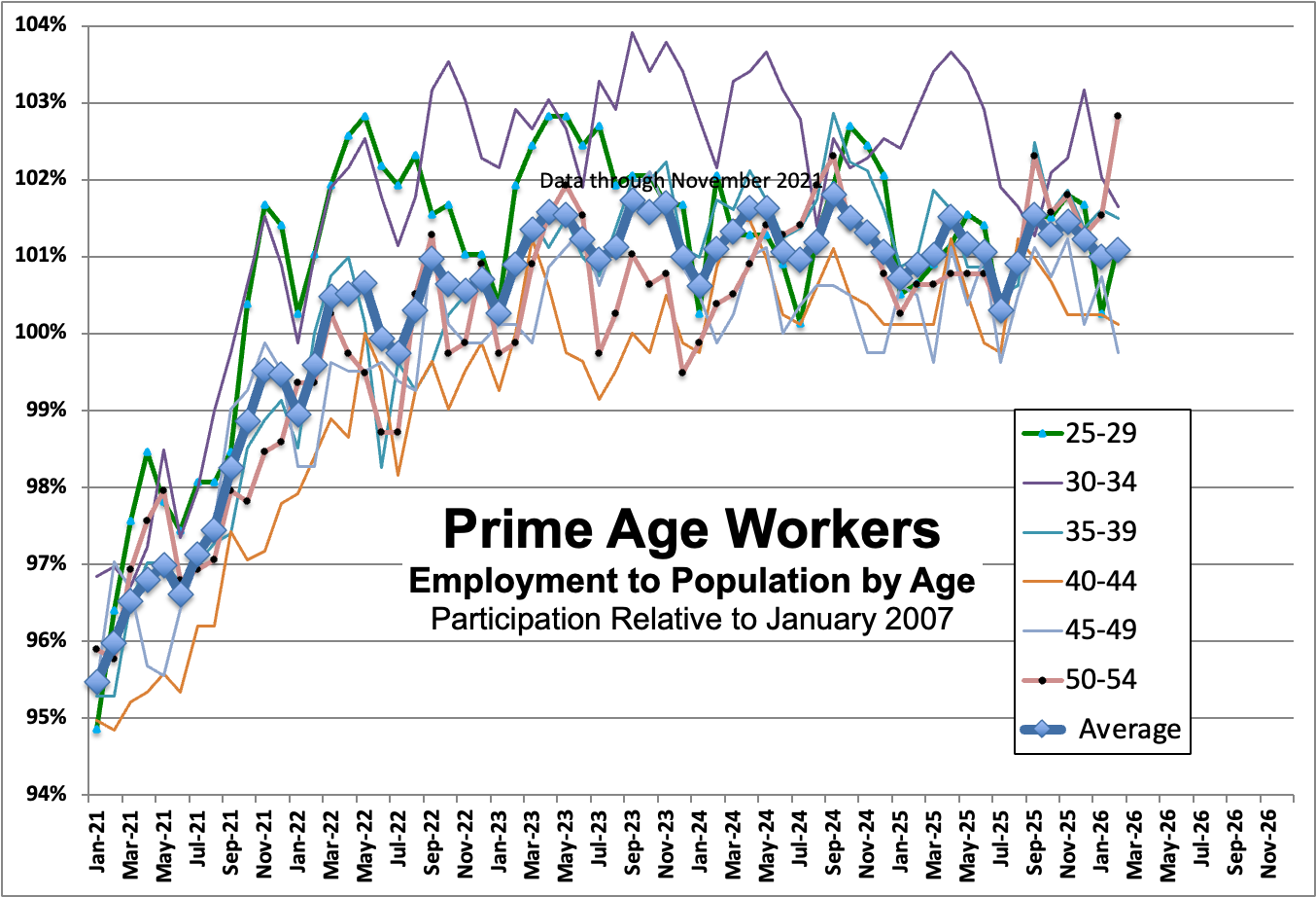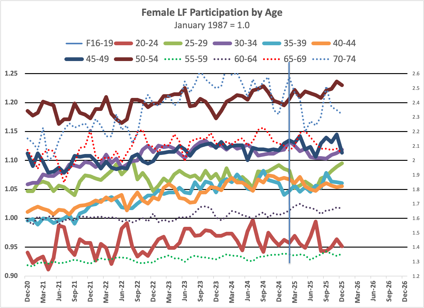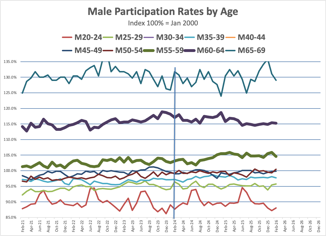 Has there been any change since the current Administration came into office? Basically, no. For the labor force as a whole, there’s little change in prime age participation. For men, there’s a slight rise age 55-59 and a slight fall age 60-64, but basically there’s no change relative to February 2025, or for that matter relative to January 2021. For women, there’s a slight rise age 50-54, but we can also see modest secular increases age 30 and above.