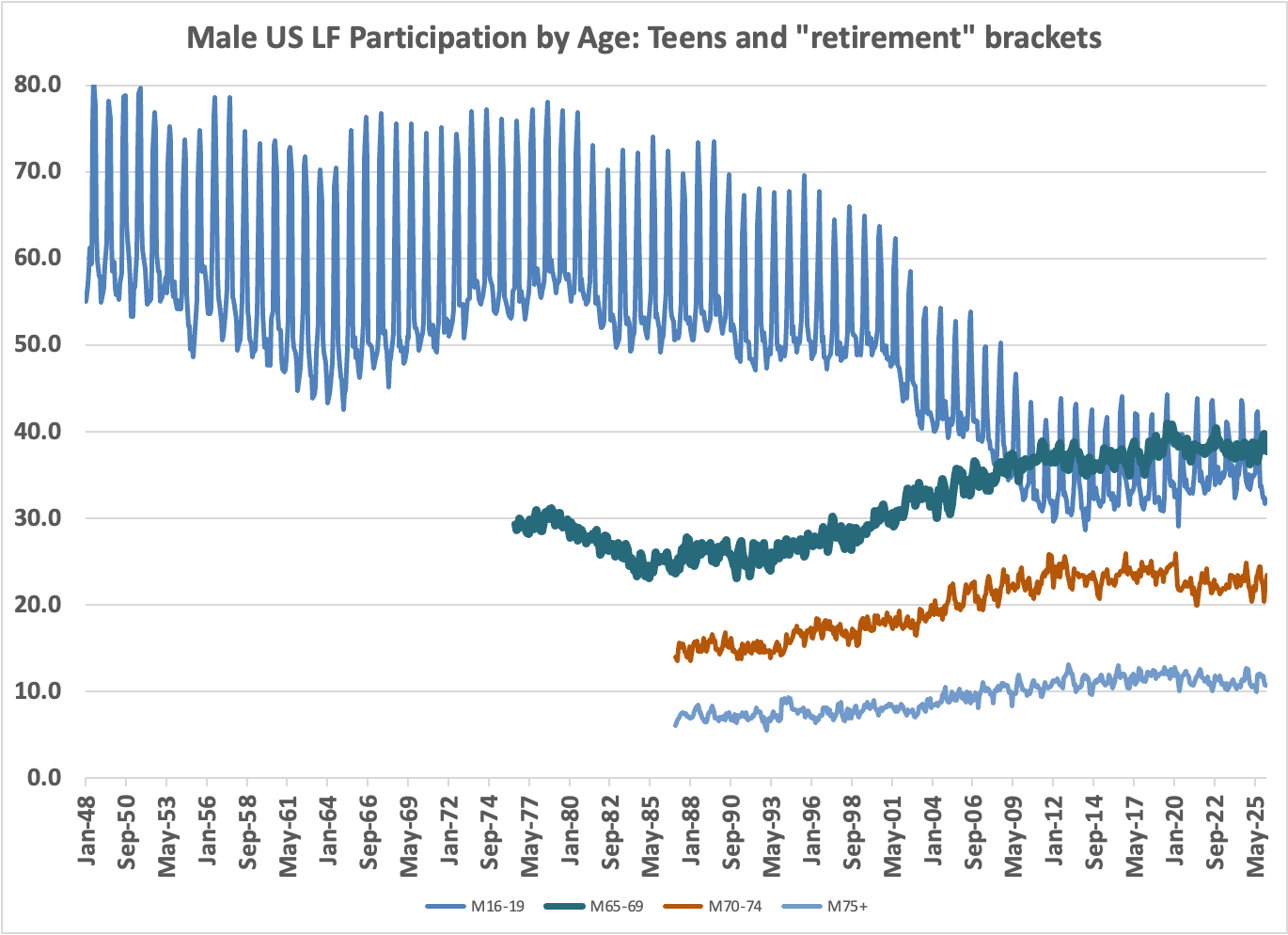 This hides divergent behavior by gender. Participation by prime-age men fell decade after decade, until rising the past 5 years for those age 45-59. I give a separate chart above for teens and those often thought as retirement age. You can see the seasonal volatility of teen participation, as well as the large decline, mostly after 1990. More kids completing high school? Jobs squeezed out by after-school activities? I don’t know.