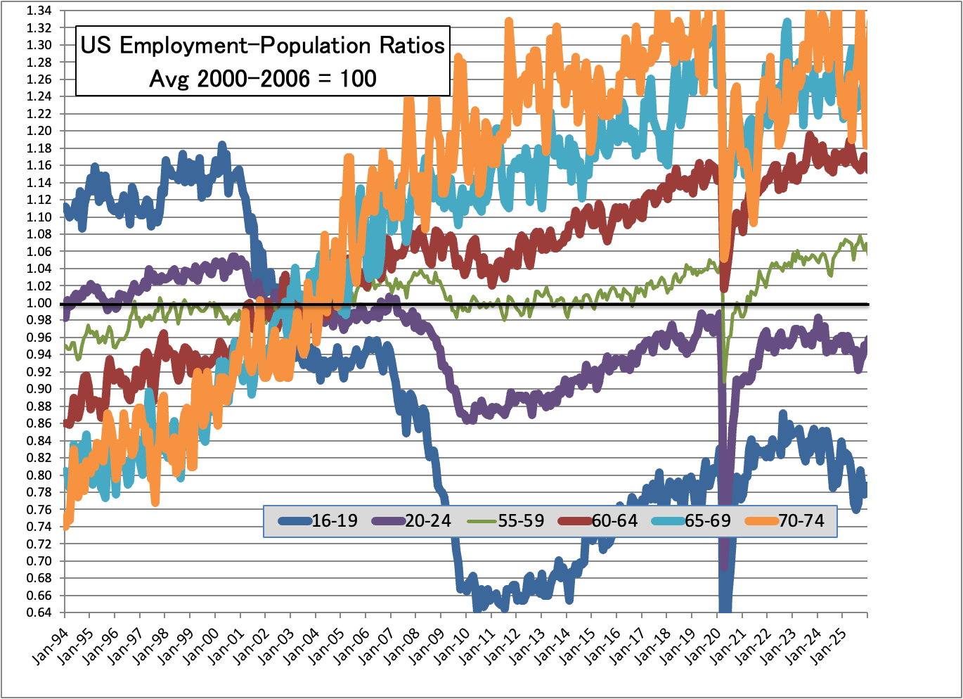 Now using an index hides that in absolute terms, relatively few Americans above age 65 are in the labor force. In January 1994 just under 11% of those age 70-74 were in the labor force; it’s now 19%, so the share has climbed 80% over three decades. For age 65-69, the rate has gove from 20-21% to 32%, a 50% increase. (Given volatility, max to min is greater…)