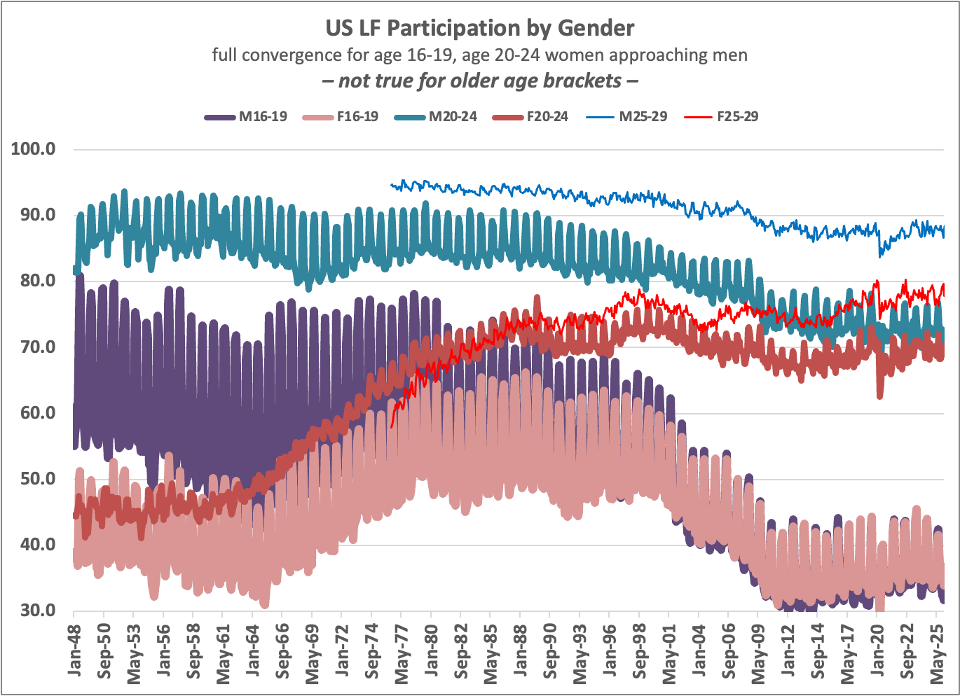 I’ve been tracking the monthly Bureau of Labor Statistics data release for 30 years, as I presented current data in the introductory “Principles of Economics” courses that I taught every term. Here I focus on data series that are less widely reported, participation rates (the share of people in the labor force, working or seeking work) by age and gender. 1