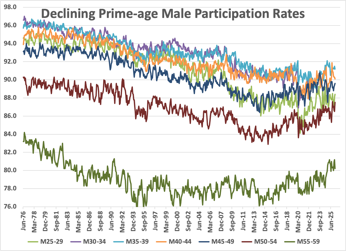 The current reporting categories are available by gender only from 1987, when brackets were added for ages 70-74 and 75+. Otherwise data go back to 1976 for most age brackets, but to 1948 for ages 16-19 and 20-24. Overall data however go back only to 1994. Even within that short period of 3 decades, we see dramatic changes at the young and old ends of the labor market, in my chart expressed as an index relative to the period leading up to the Great Recession. In contrast, for prime workers – here I only include age 55-59 – there’s little change.