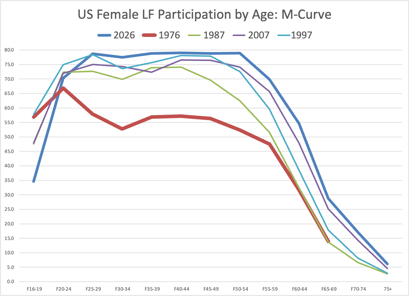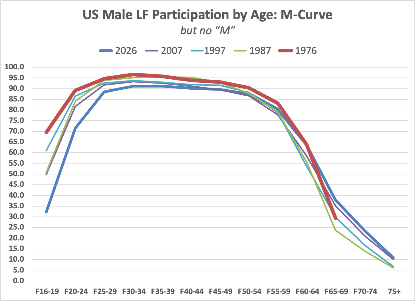 For consistency/comparability, I created the same chart for men. No “M” at any point, but instead of 2026 lying above the other curves, until age 55-59 it instead lies below.